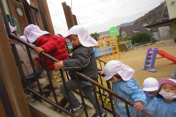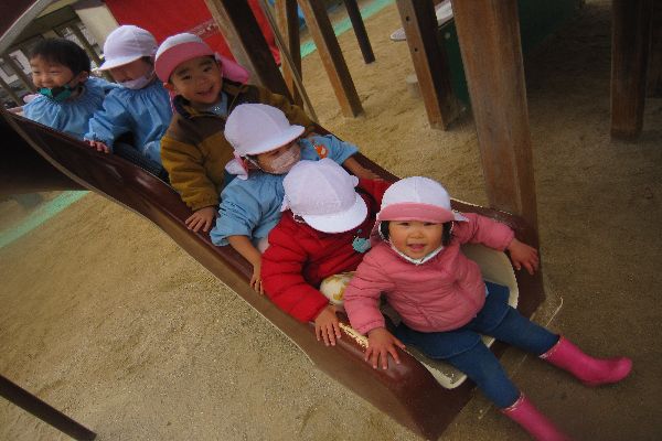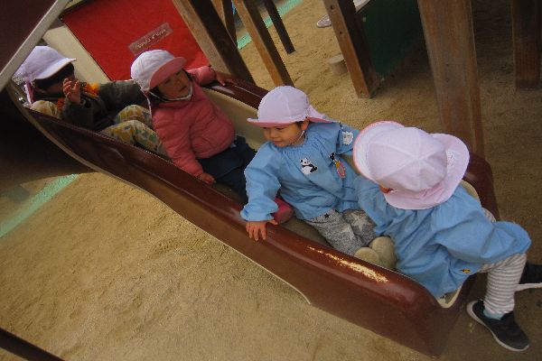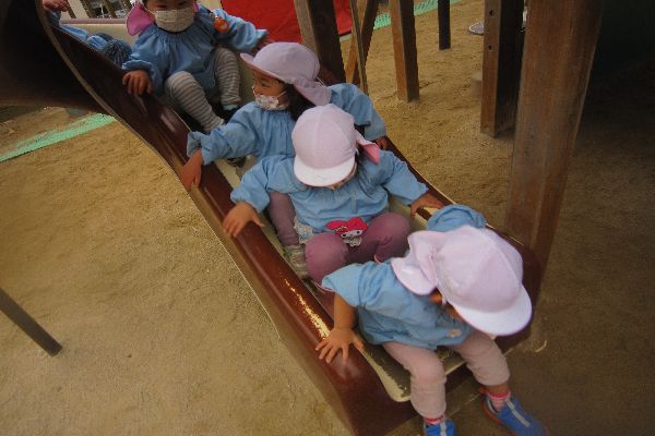 今週から早いお帰りになりました。今日はいちご組さんと一緒に、園庭で遊びました。滑り台をみんなで滑って、楽しんでいました。