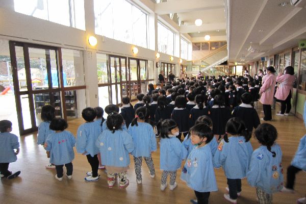 今日は2学期最後の登園でした。終業式があり、ホールにみんなで集まって、園長先生のお話を聞きました。冬休みの過ごし方、お正月についてなどお話を聞きました。