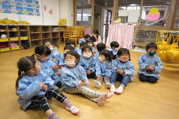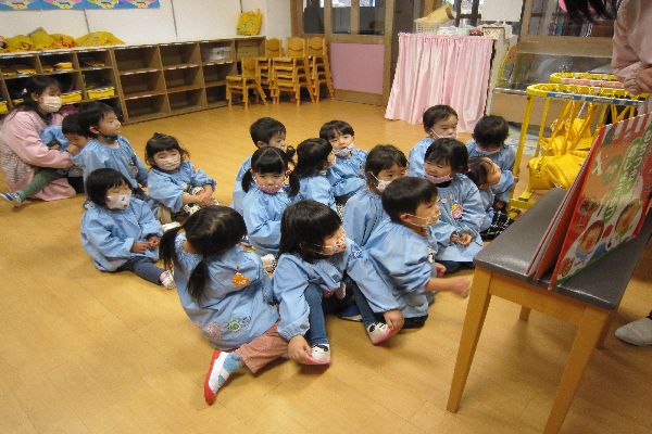 お部屋では、「おもちつき・おしょうがつ」の大型絵本を見ました。この前のおもちつきのことを思い出したり、お正月の遊び・挨拶などお話を見ました。