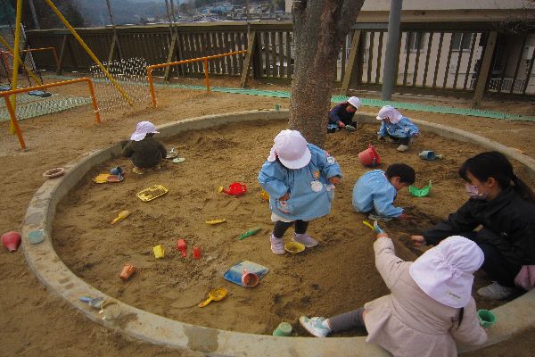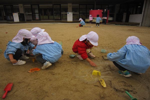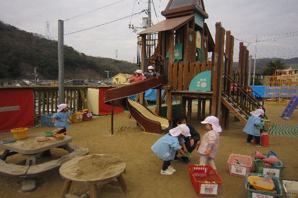 園庭で、砂遊びやすべり台など、元気いっぱい体を動かして遊びました。寒くても、水を運んで海を作ったり、泥団子を作ったり、楽しんでいます。