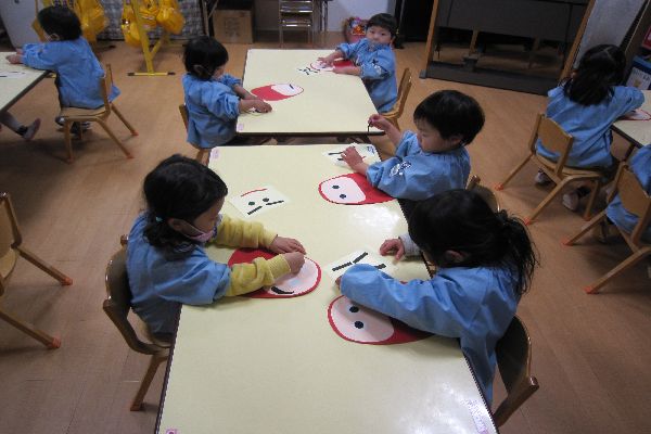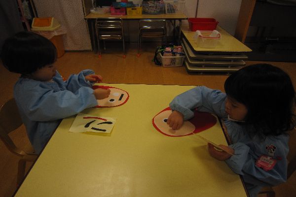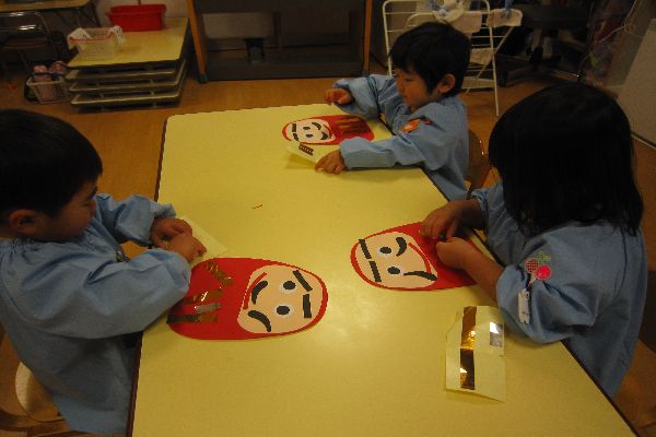 たくさん遊んだ後は、だるまを作りました。顔のパーツや、体にキラキラシールを貼りました。眉毛やひげの角度で、さまざまな表情のだるまができて、とてもかわいく仕上がりました。
