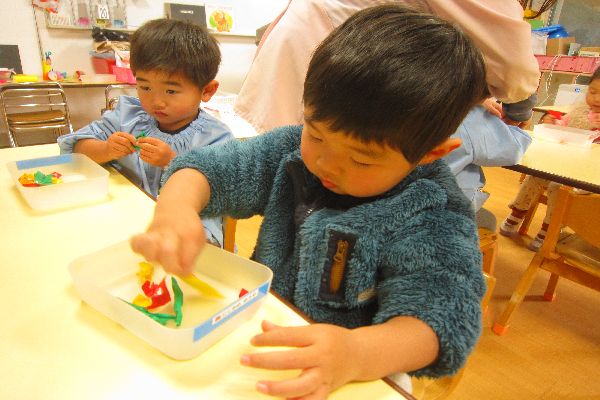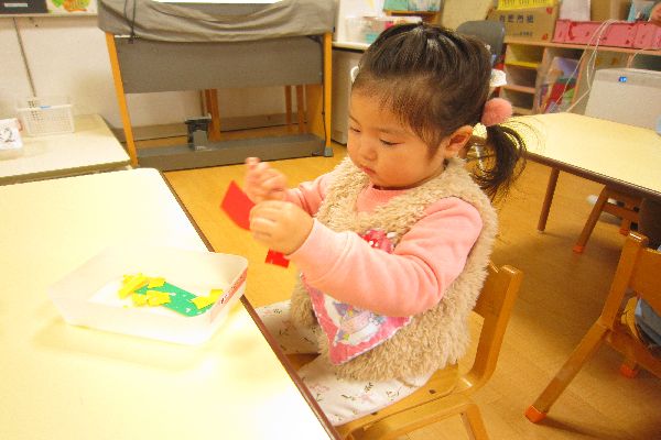 たくさん遊んだ後は、ひよこ組さんと一緒に製作をたのしみました。紙をちぎっていく製作では、「むずかしかった」と言っているお友達もいましたが、1回やり方がわかったら、根気よく頑張っていました。