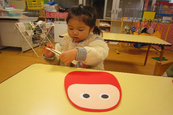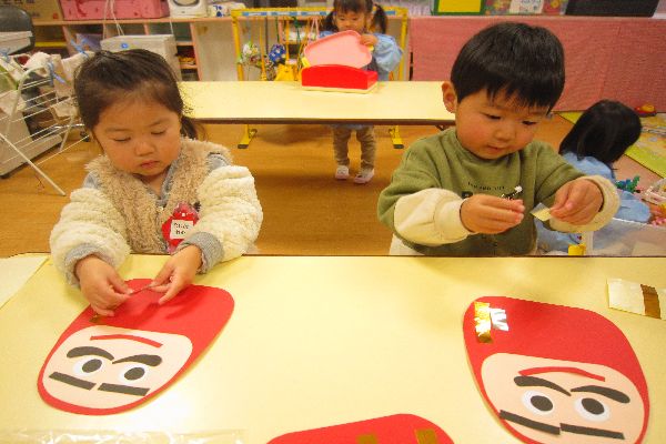 いちご組さん、今日は製作を楽しみました。だるまさんを作りました。