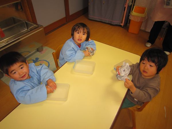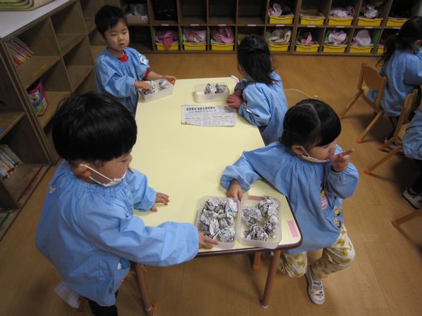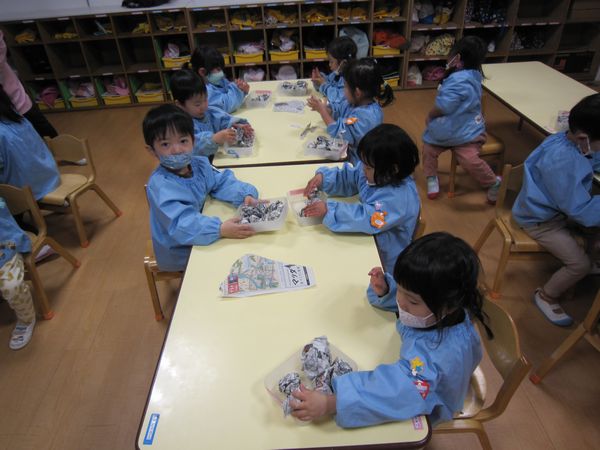 たくさん遊んだ後は、新聞紙を丸めてボールをたくさん作りました。明日の豆まきで、豆の代わりに投げたいと思います。