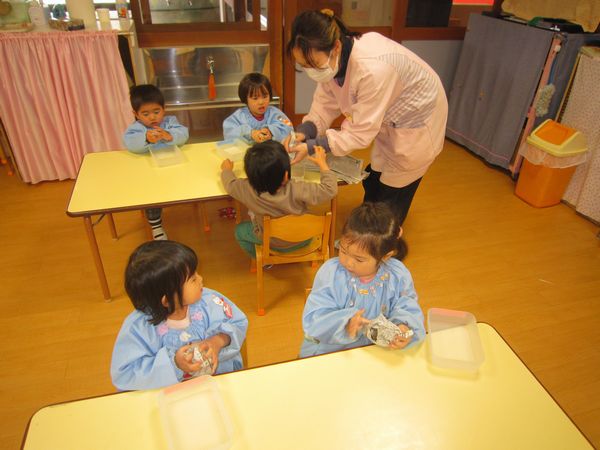 2023/02/02 ひよこ組さん たくさん遊んだよ!/新聞紙を丸めたよ!
