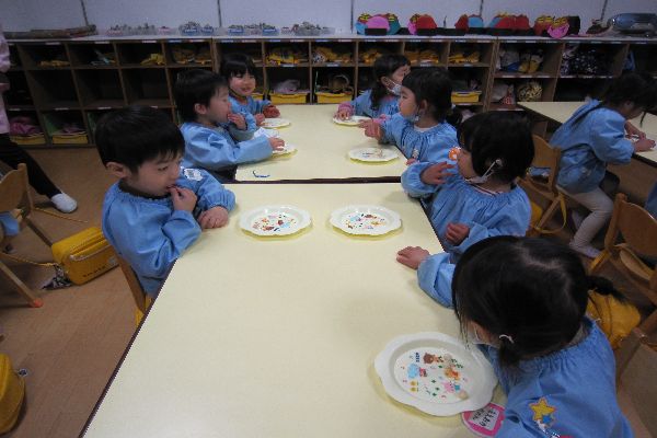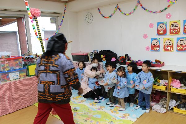今日は節分です。朝から、「鬼をやっつけるぞ!」と張り切ったり、ちょっとドキドキしたりしていました。お部屋に鬼がやってくると、びっくりしながらも頑張って「おには~そと!ふくは~うち!」と大きな声で言いながら新聞紙の玉を投げて鬼をやっつけました。怖かったけど、頑張ってやっつけてみんな強いひよこ組さんになりました。