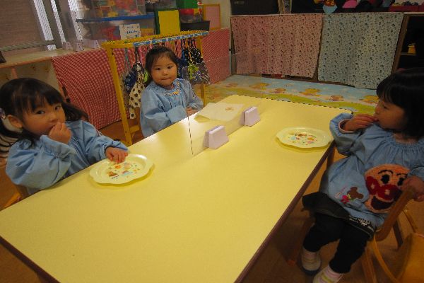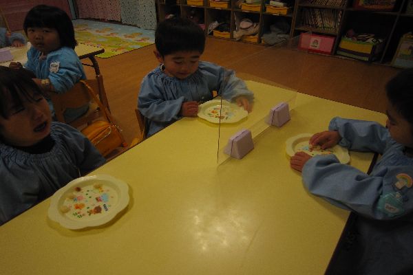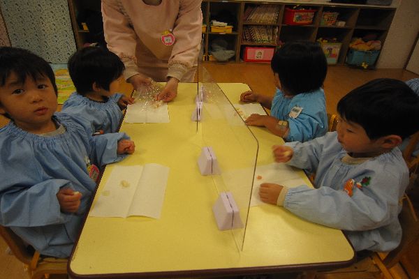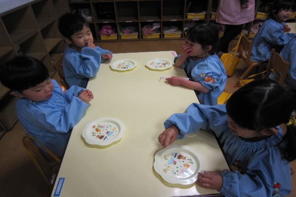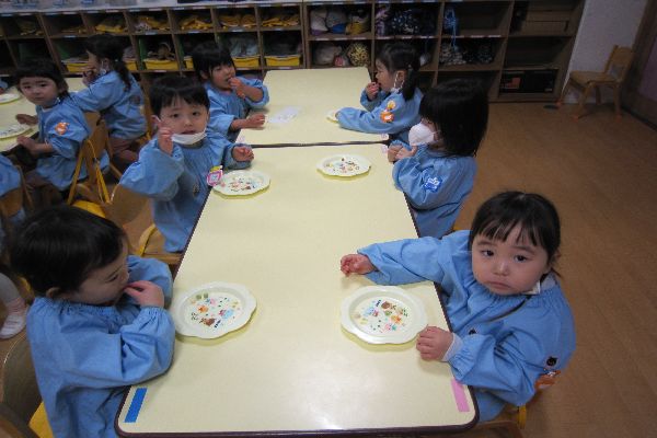 みんなで豆菓子を食べました。年の数より少し多く食べて、「おいしい!」とみんな喜んでいました。