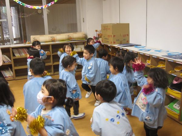 今日もみんなでダンスを踊りました。今日は腕にキラキラを付けて踊りました。キラキラを付けると、さらに気持ちも盛り上がり、やる気満々のひよこ組さん。途中の掛け声も元気にかけながら、元気いっぱい踊りました♪