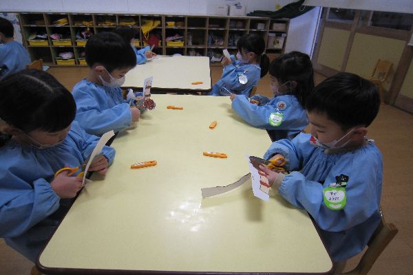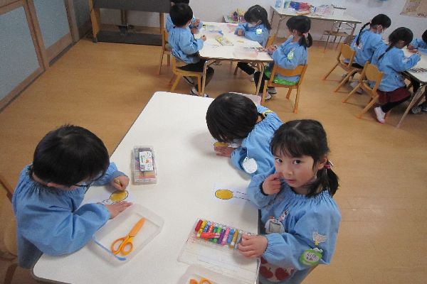 と話をしながらクレパスで色を塗ってハサミで切ってつくしの製作をしました!