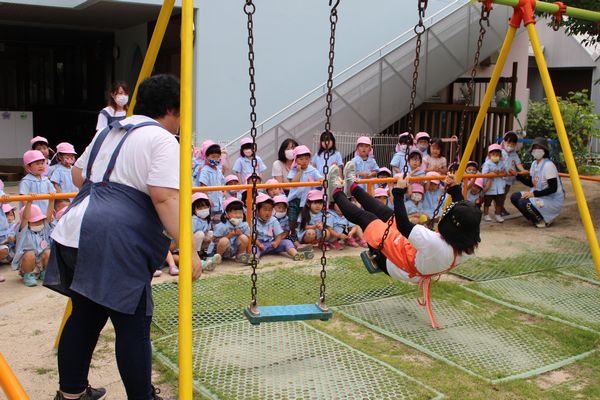 毎日、園庭で元気いっぱい遊んでいます。滑り台やブランコ、ジャングルジム、楽しい物がたくさんあります。みんなが安全に楽しく遊べるように、遊び方のお約束のお話を聞きました。