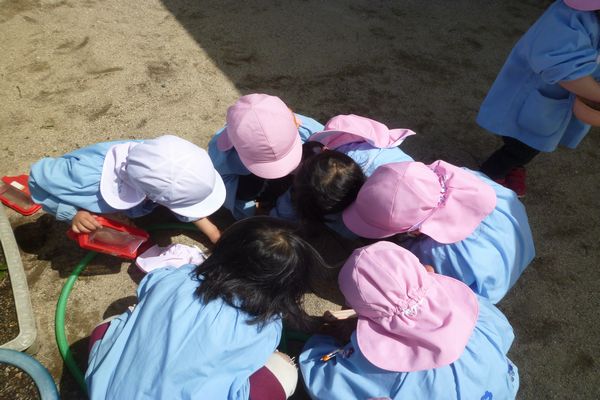 はじめての14時降園の日は幼稚園でいっぱい遊びました!みんなで虫探しをしたりジャングルジムに上ったり、砂遊びもして思いっきり遊んで楽しかったね!