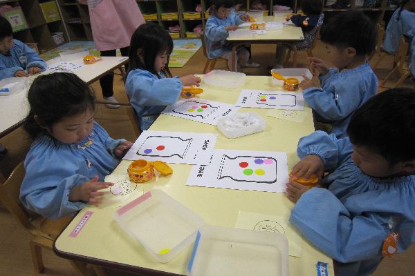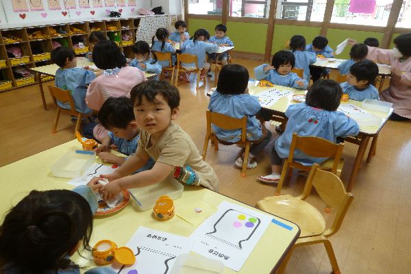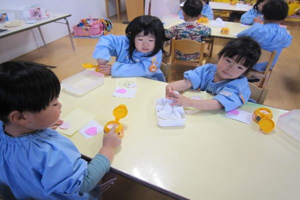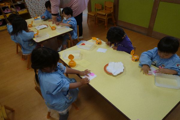 今日はあめだまをみんなで貼って楽しみました!「何味のあめ玉がおいしいかな!?」「いちごがいい!れもんがいい!」などお話をしながら楽しんで、最後はみんなで瓶の中に貼ったあめを食べました!