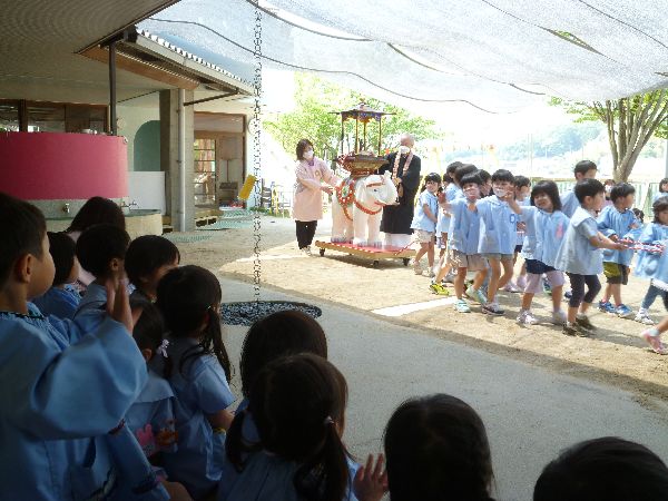 花御堂を囲ってみんなで花まつりをしました!白いぞうに乗られたお釈迦様をお迎えして園長先生のお話を聞きました。お釈迦様は天と地を指さしておられ、たった一つしかない命はとても尊くて大切なものであるという事をお話ししてくださいました。