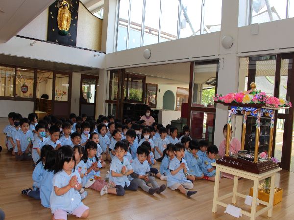 みんなが毎日手を合わせてお祈りをするお釈迦様のお誕生日をみんなははなまつりと言ってみんなで甘茶をかけてお祝いします。