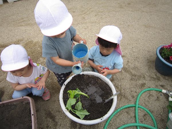 25日に園庭のプランターにさつまいもの苗を植えました。