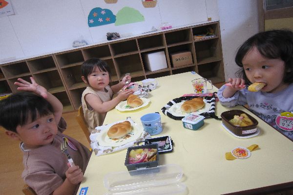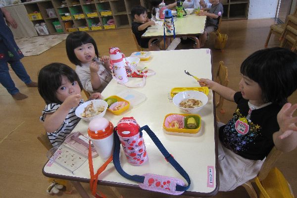 パンと牛乳、食缶式給食も美味しそうに食べていました。