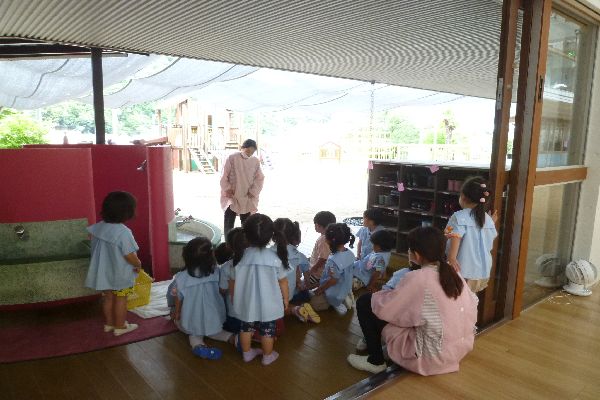 「はだしで外に遊びに行った後は足洗い場で洗って足を拭いてからお部屋に入ろうね!」