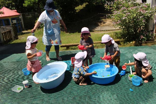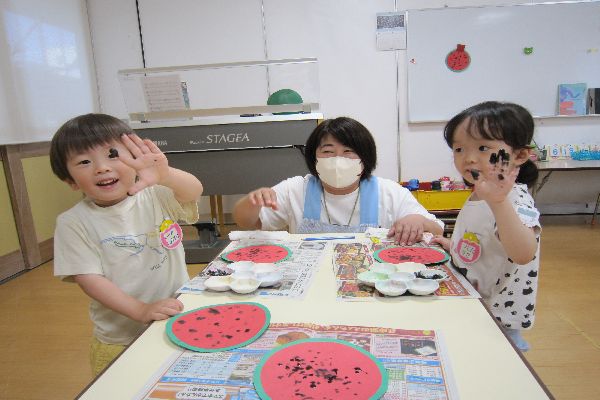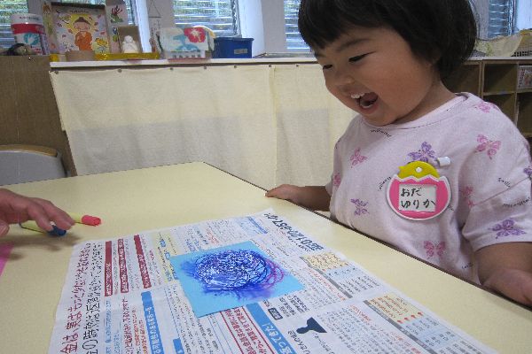 描いた絵に水を吹きかけ、にじんでいく絵を見て
