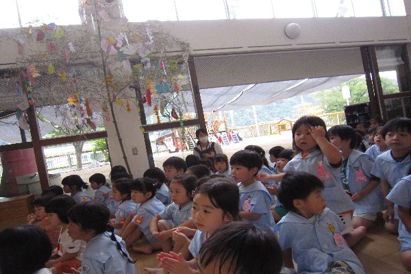 そして7日に園児みんなで七夕会をしました。おりひめ様とひこぼし様の話を聞いたり、お歌を歌ったりしました!最後には最近楽しく踊っていた「じゃんけんパラダイス」と「ね うし うま」の踊りをしました♪楽しかったね!