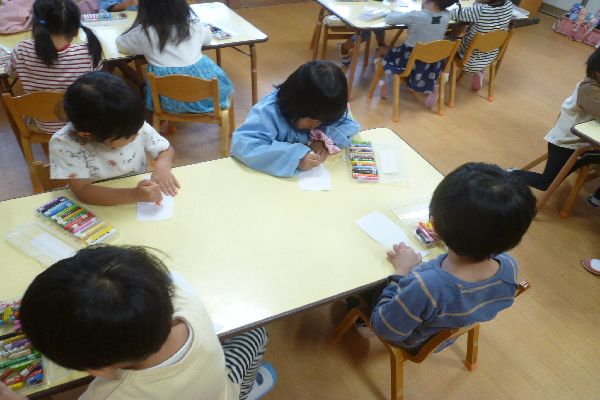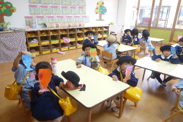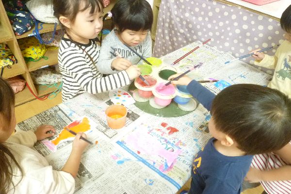 赤、青、黄色、オレンジ、ピンクなど、それぞれ自分の好きな色を選んで「オレンジジュース!」「バナナジュースにする!」と絵の具で色を塗りました!