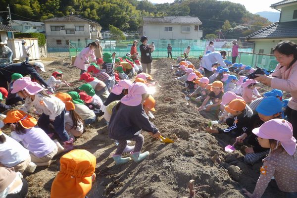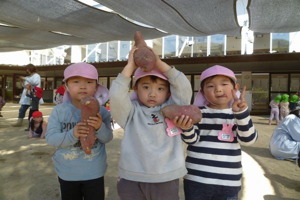 みんなのお顔よりも大きなお芋が沢山土の中から顔を出していて「すっごく大きいよ!」「こんなに大きなお芋がとれたよ~!」と喜んで芋を掘って大きなお芋を運びました!