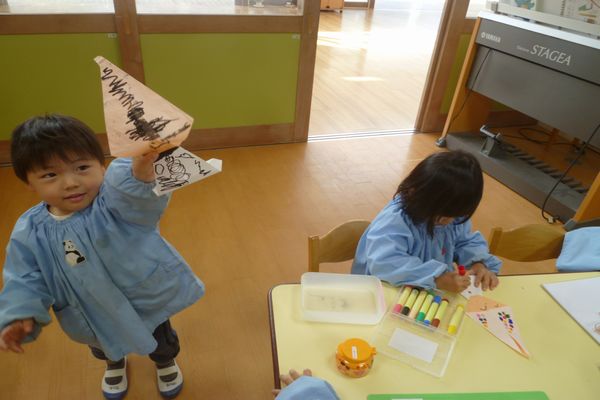 こびとの製作をしました。みんなのお部屋の天井に飾ったね!お顔や服の柄も上手に描くことができました。