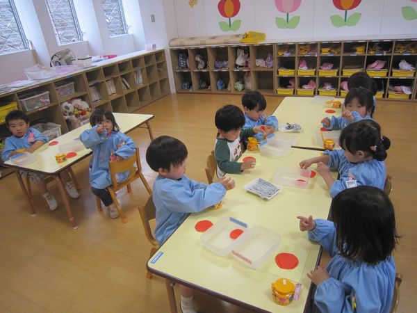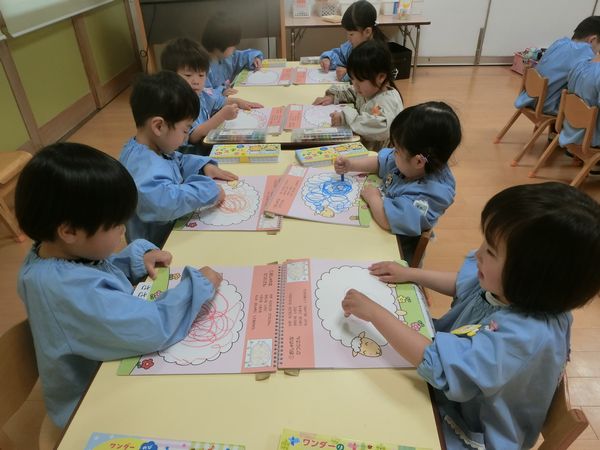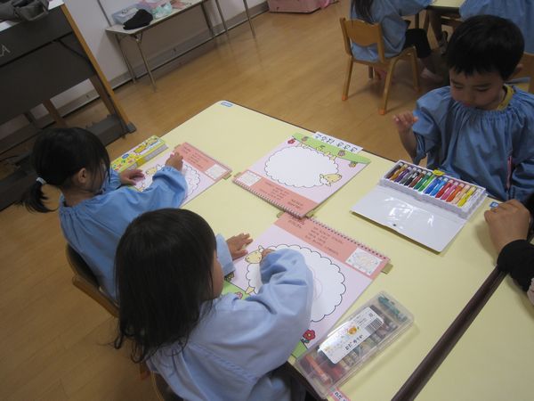 クレパスをつかってクレヨン遊びもしました。しっかり持って大きく羊さんに色を付けることができました☆彡