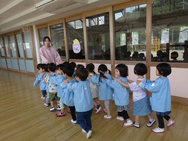お並び順番で並んでお友達の肩をもって列車になりました!