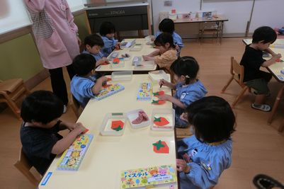 水曜日に、折り紙でいちごを折りました。角を折っていちごの形にし、ヘタを貼って、クレパスで種を描きました。四角い形が、いちごの形になると。「わ~!」と喜んでいました。真っ赤ないちごが2個できて、「おいしそう♡」と楽しく取り組みました。