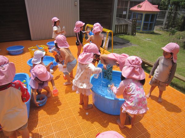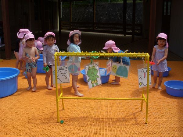 水遊びも沢山のおもちゃを使って楽しんでいます♪水鉄砲などでの的当ても上手にできました!