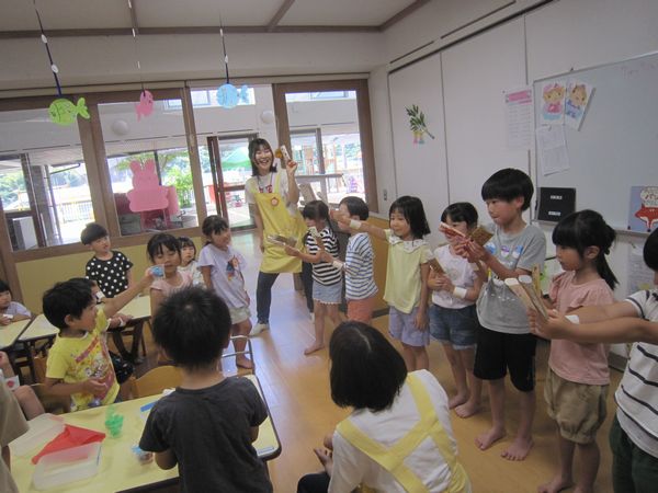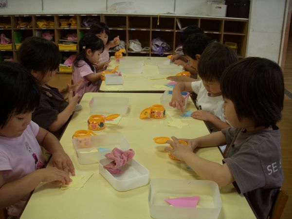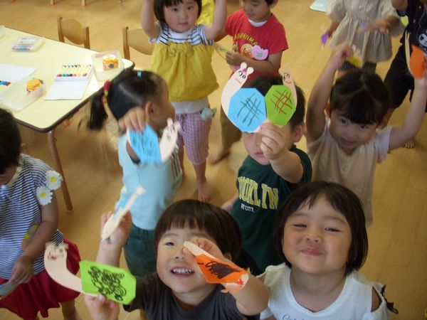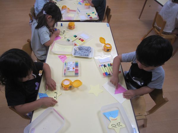 七夕に向けておりひめとひこぼしを作りました☆彡上手にお顔や服を描くことができました。