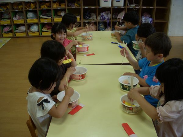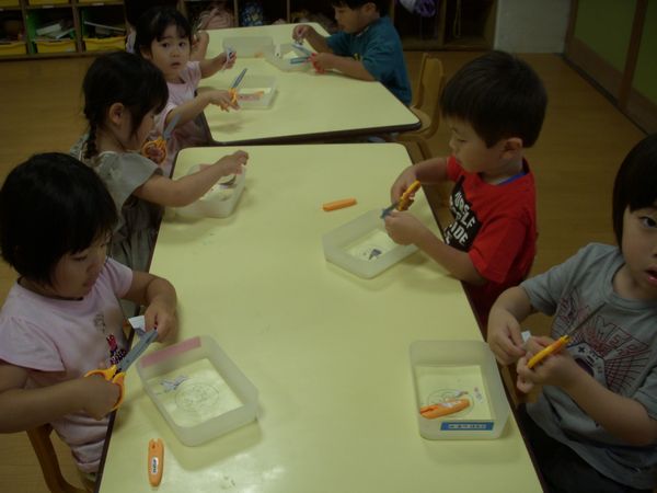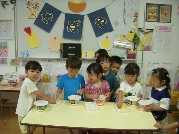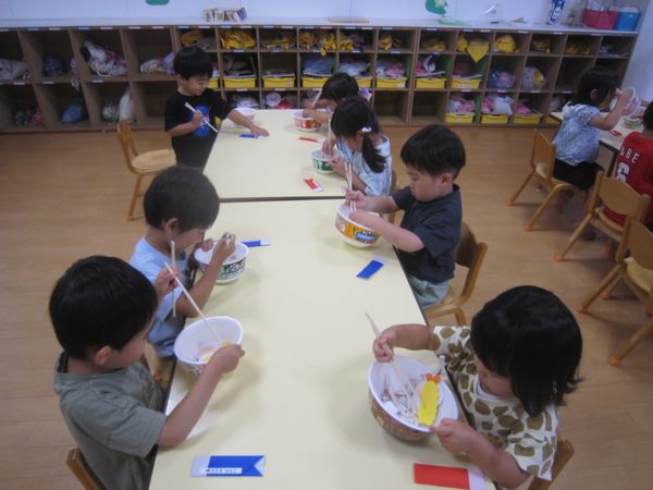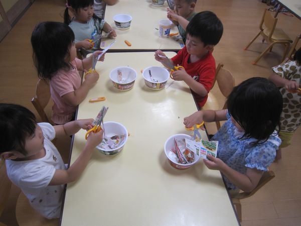 24日(月)は、はさみを使った活動をしました。広告を細く切って、おそばを作りました。回数を重ねていくごとに、はさみの使い方がスムーズになってきています。できたおそばにエビフライ・ゆでたまご・なるとをトッピングしてみんなで食べました。「おいしい~」と喜んで食べていました。お店屋さんとお客さんにわかれて、おそばやさんごっこも楽しみました。