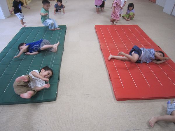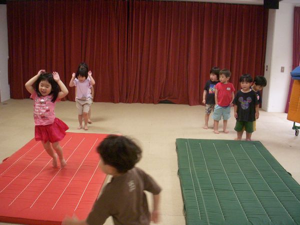 25日(火)には、マット運動をしました。いろんな動物になったり、ごろごろ転がったり、できるお友達は前転に挑戦したり、しっかり体を動かして楽しみました。