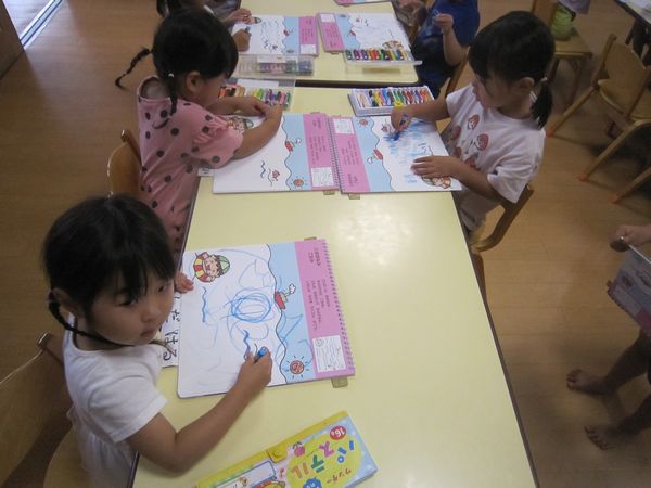 27日(木)は、クレヨン遊びをしました。おおなみ~・こなみ~と海にたくさんの波を描きました。