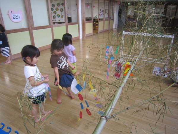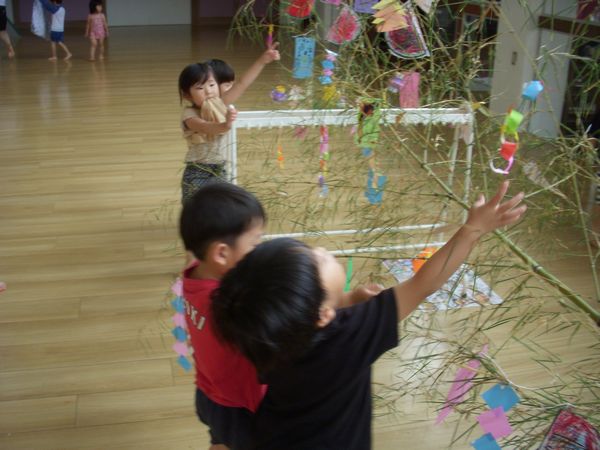 幼稚園に大きな笹が届き、作った七夕飾りを付けました。ホールに飾ってあるのを見て「わあ!すごーい!」と喜んでいました。