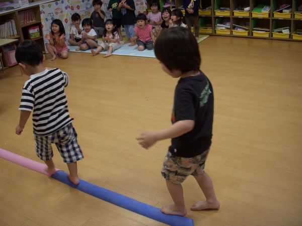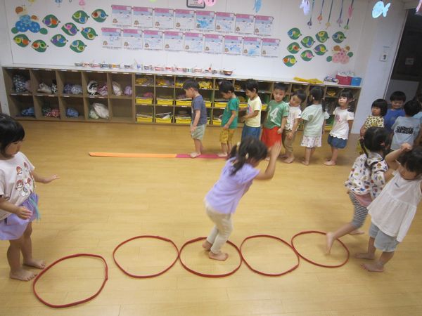 28日(金)は、雨で外では遊べませんでしたが、お部屋の中で、スポンジ平均台を渡ったり、わっかの中をジャンプしたり、体操をしたりと、元気いっぱい過ごしています。