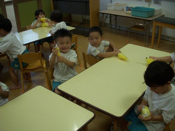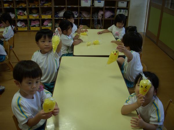 また、親子競技で使うバナナをつくりました!目と口のシールもつけてかわいい顔が完成しました!