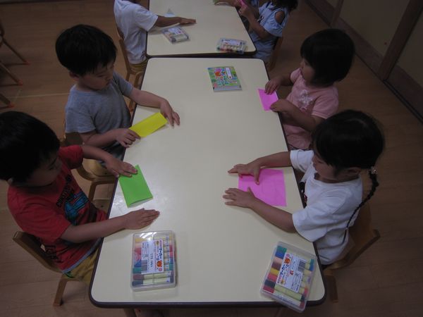 10日(火)は、折り紙をしました。角と角を合わせて折り、できた形が何に見えるかイメージして、マーカーで絵を描きました。「ぞう」「新幹線」など、思い思いの作品ができあがり、お家でもお話されたことと思います。