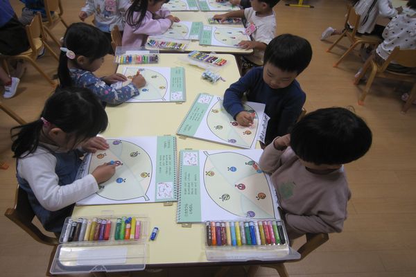 クレヨン遊びで、いもむしを描きました。いろんな色を使って、丸い体をつなげて、カラフルいもむしができました。
