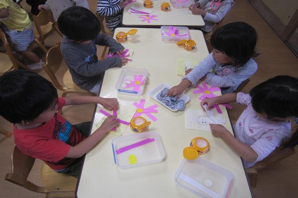 コスモスの製作もしました。細長い折り紙を4枚くっつけて、3色のコスモスができました。天井に飾って、みんな喜んでいました。