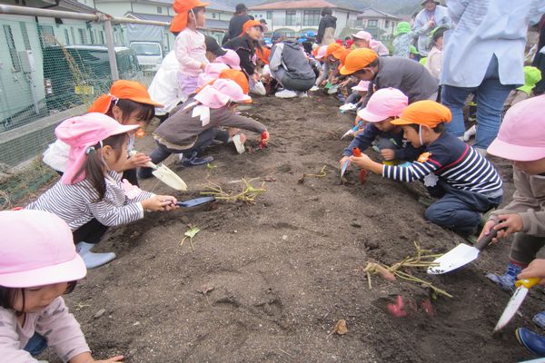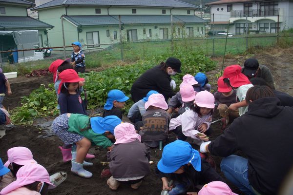 お芋ほりに行きました。年長組のお兄ちゃん・お姉ちゃんと一緒に頑張って掘りました。「大きいのがあった!」「重た~い!」と土の中から、たくさんの芋が出てきました。お土産のお芋は、おいしくいただいたかな?お手伝いいただいた保護者の方、ありがとうございました。