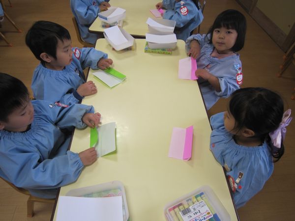折り紙で雪の小人を作りました。お顔・体をそれぞれ折り、合体させて、最後にお顔や帽子・洋服に模様を描いて、かわいい小人さんができました。