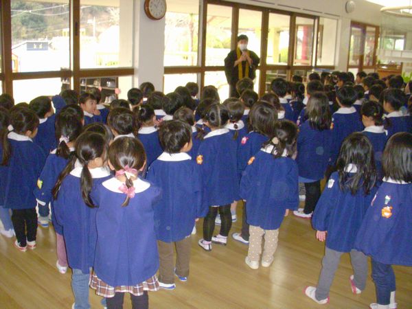 今日は2学期最後の日でした。ホールにみんなが集まって、終業式がありました。副園長先生から、「まず今日、1年間一緒に過ごしてきたお友達・先生・み仏様にありがとうと言うこと。そして、新しい年になったら、今年もよろしくね、と挨拶をすること。」をお話してくださいました。冬休みには、きっと楽しいことがたくさん待っていると思います。元気でまた、3学期に会えるのを楽しみにしています。