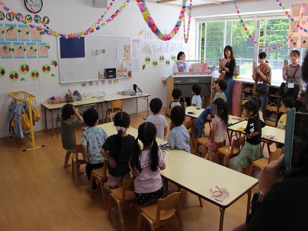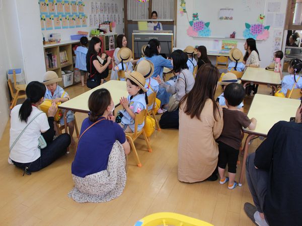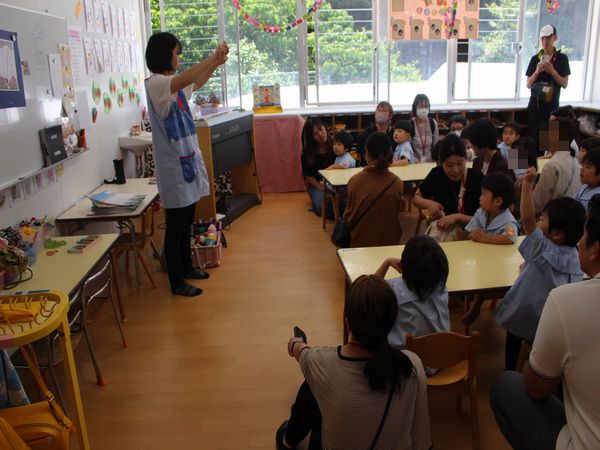 今日は、参観日がありました。お家の方に歌を歌ったり、お念珠を使って挨拶をしたり、頑張っているところを見てもらいました。クレヨン遊びの様子も見てもらい、雨をたくさん描きました。親子でふれあい遊びもし、楽しく過ごしました。ご来園いただき、ありがとうござました。