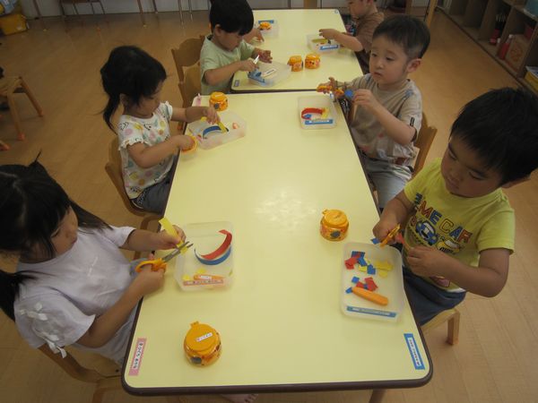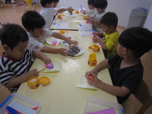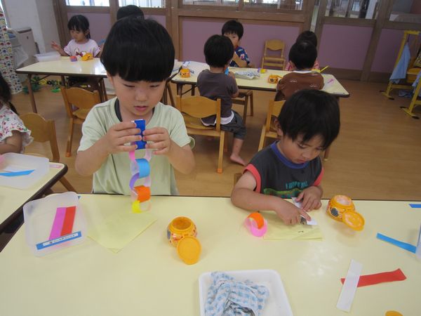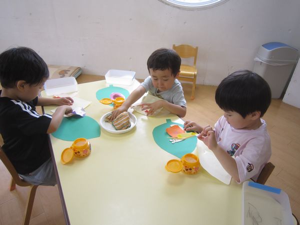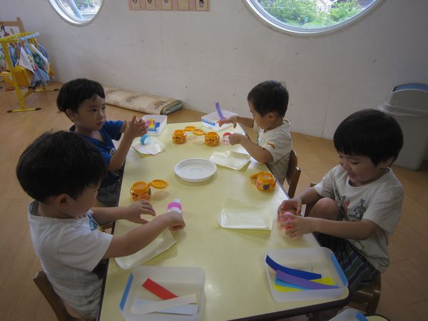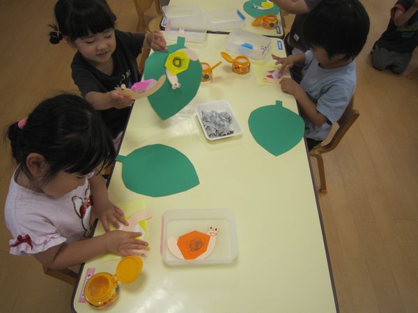 先週作ったかたつむりさんを、のりを使って葉っぱにのせてあげました。2匹仲良く葉っぱに並んで、「おしゃべりしてるのかな?」「何して遊ぶって言ってるのかもよ!」など、完成して喜んでいました。
