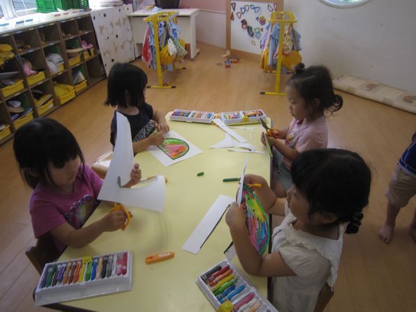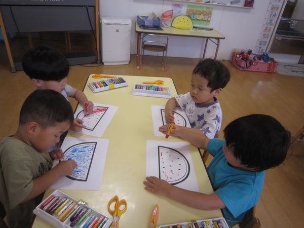 スイカは、クレパスで色を塗って、ハサミで切りました。赤か黄色、好きな方を選んで塗り、おいしそうなスイカができました。