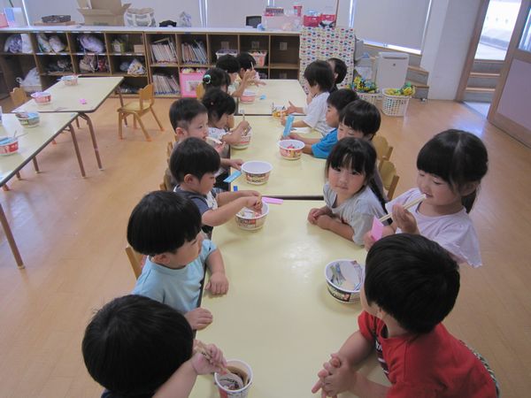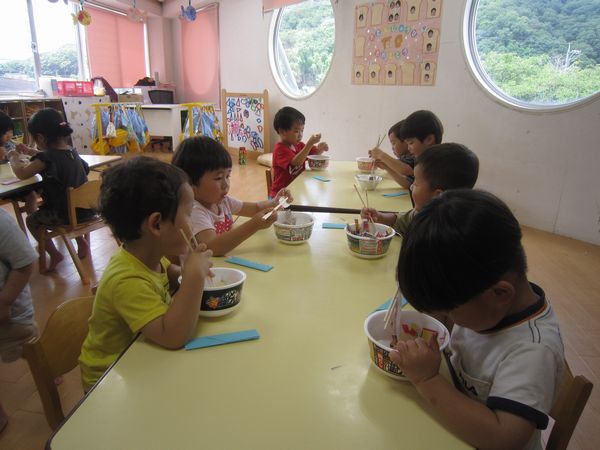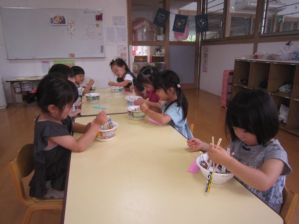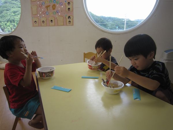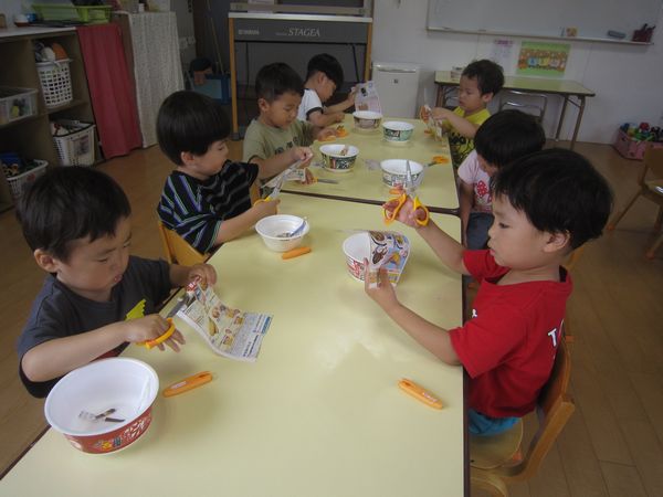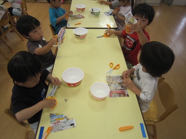 広告を細く切っておそばを作りました。はさみを「グーパーグーパー」と動かし、頑張って続けて切りました。先日持ってきていただいた、カップ麺の容器を使って、中に切ったおそばと、エビフライ・なると・ゆでたまごをトッピングして、おいしいおそばができました。自分で食べたり、おそば屋さんごっこをして楽しみました♪