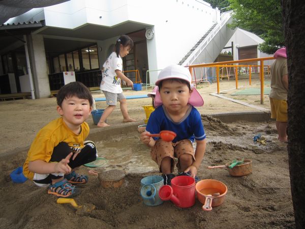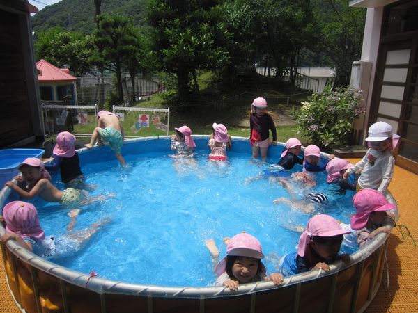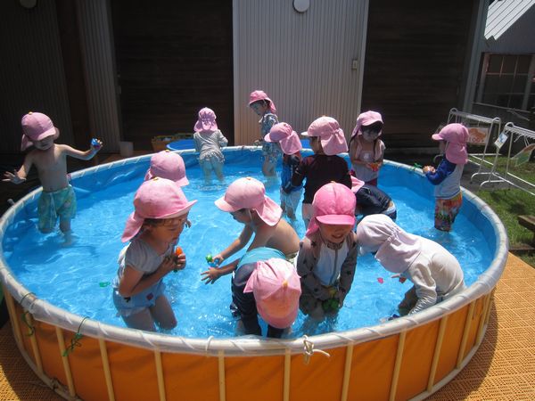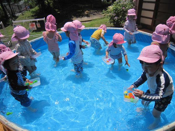 木曜日はお天気も良く、プールの水が冷たくてとても気持ち良かったです。ワニさんになってお散歩したり、宝探しをしたり、おもちゃで遊んだりと時間いっぱい楽しみました。