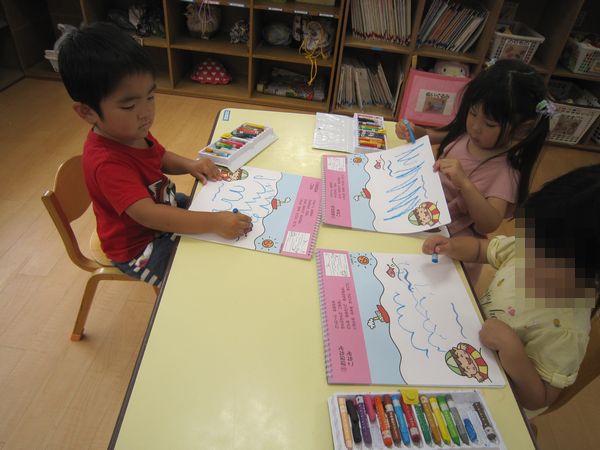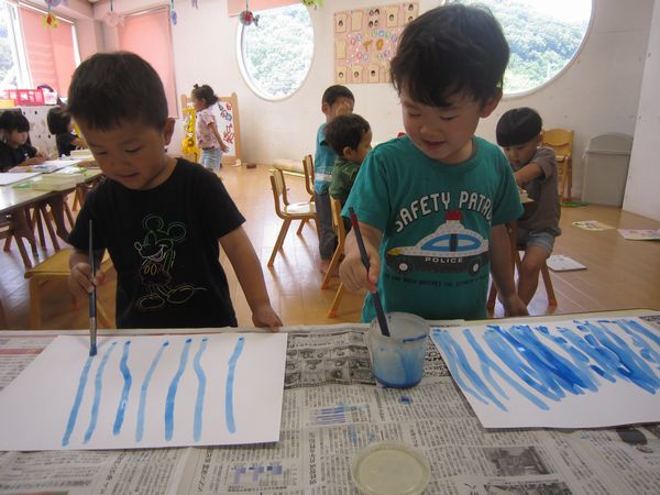 今回は、「おおなみこなみ」を描きました。海の中にたくさん波を描いて、「おさかなさん、喜んでるね!」と楽しんでいました。
