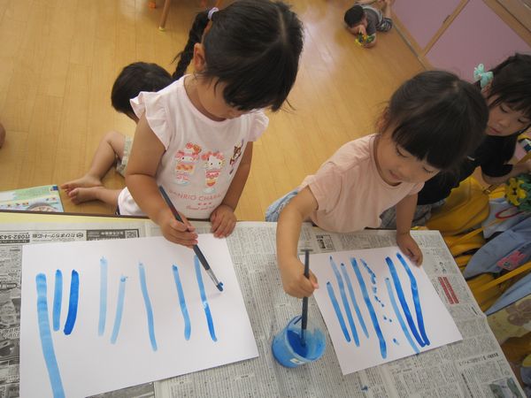 筆を使って、雨を降らせました。「あめ、いっぱいふってきた~!」と言いながら、上から下へ筆を動かし、たくさん雨を降らせました。